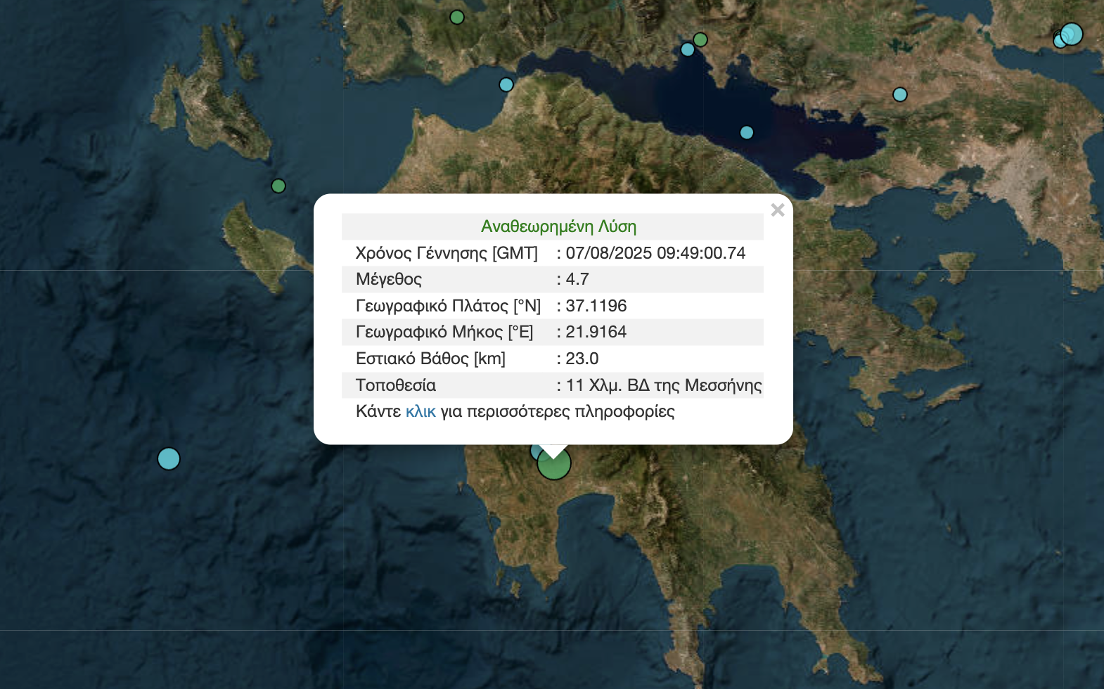 Το επίκεντρο του σεισμού ήταν 11 χλμ βορειοδυτικά της Μεσσήνης ενώ το εστιακό βάθος υπολογίζεται στα 23 χλμ