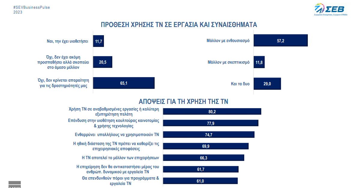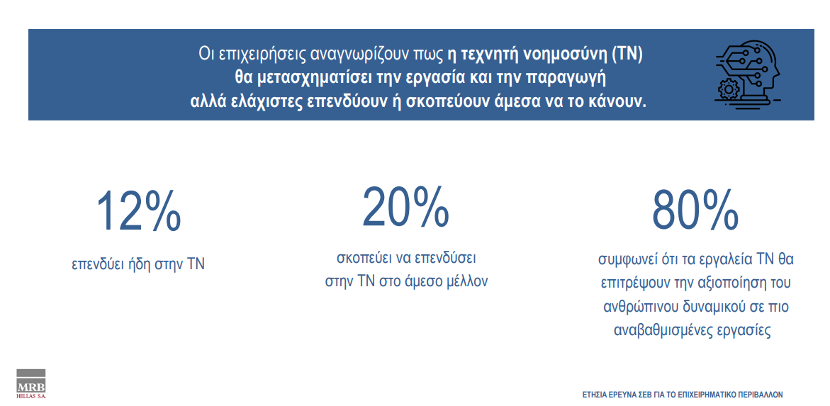 • Η τεχνητή νοημοσύνη (ΤΝ) θα μετασχηματίσει την εργασία και την παραγωγή αλλά λίγες επιχειρήσεις επενδύουν ή σκοπεύουν να το κάνουν (το 80% των επιχειρήσεων θεωρεί ότι η ΤΝ θα αναβαθμίσει το ανθρώπινο δυναμικό, το 20% των επιχειρήσεων θα επενδύσει στο άμεσο μέλλον, και μόλις το 12% επενδύει ήδη στην ΤΝ).