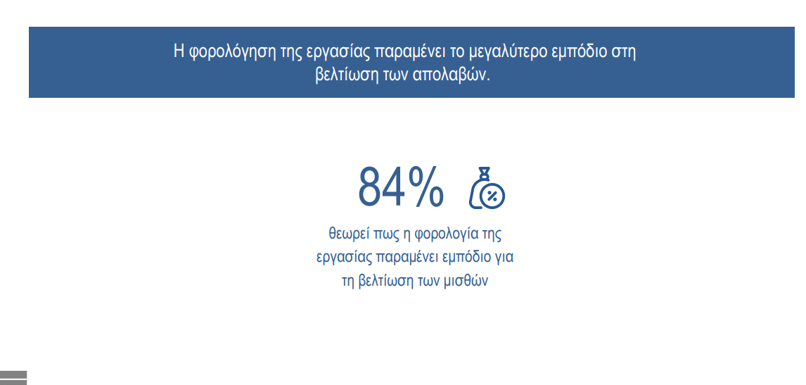 • Οι επιχειρήσεις αναγνωρίζουν ότι η ανταγωνιστικότητα τους ενισχύεται επενδύοντας στον ανθρώπινο παράγοντα (το 84% αναγνωρίζουν τη φορολόγηση της εργασίας ως  το μεγαλύτερο εμπόδιο στη βελτίωση των απολαβών των εργαζομένων).