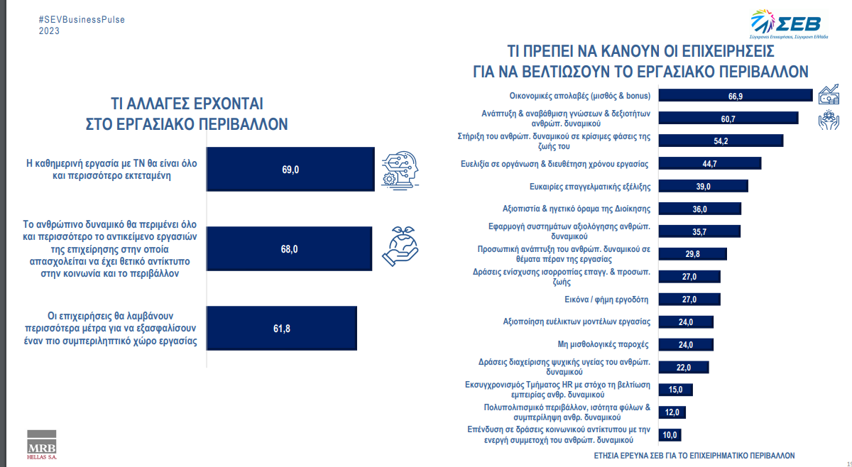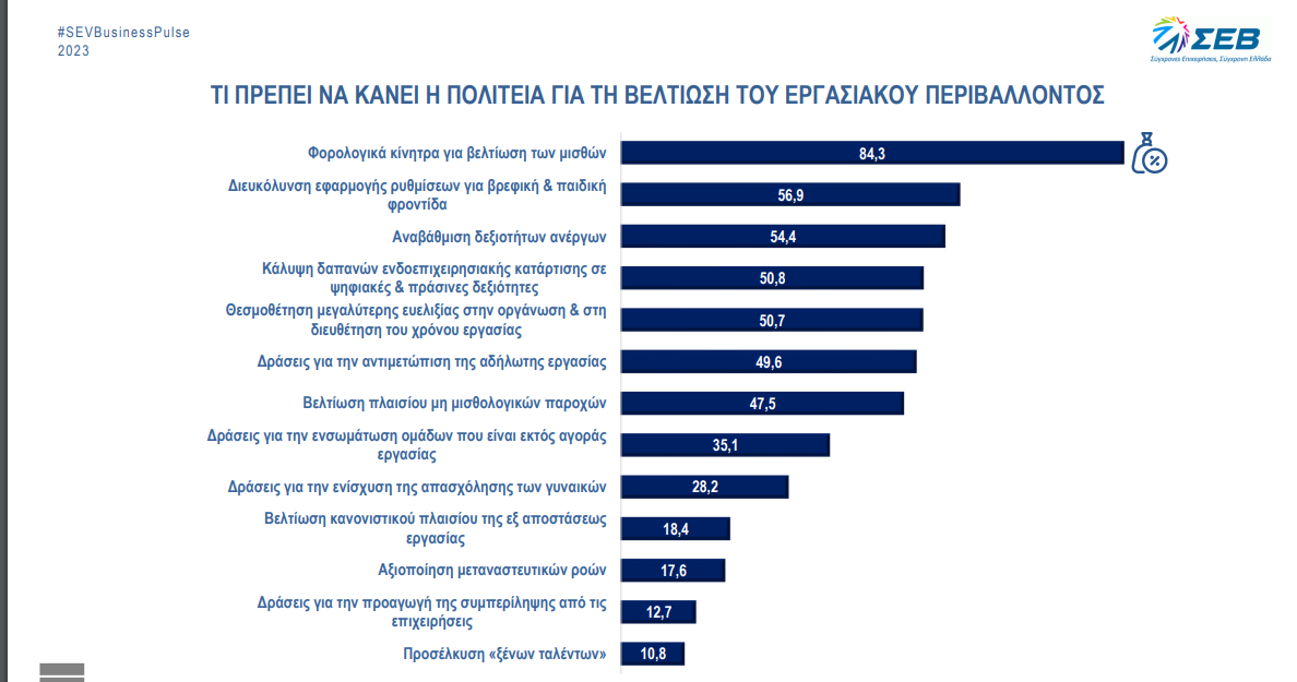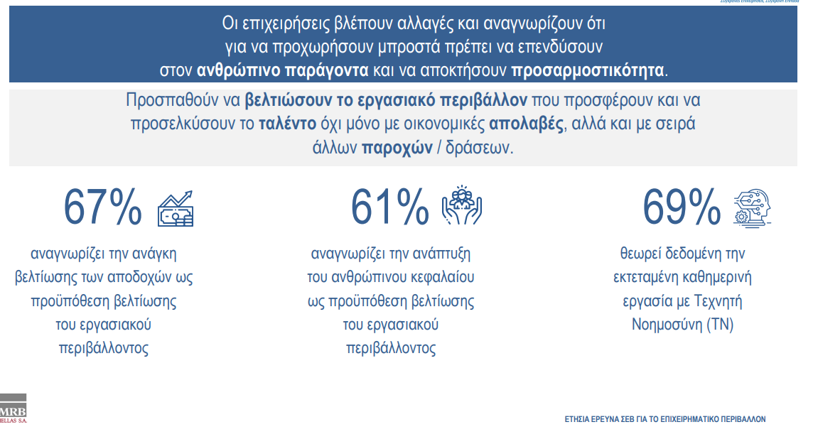 • Οι επιχειρήσεις θεωρούν ότι οι βελτιώσεις στο επιχειρηματικό περιβάλλον παραμένουν αναγκαίες (στις βελτιώσεις που χρειάζεται η χώρα: το 67% των επιχειρήσεων θέλει περισσότερη διαφάνεια & αντιμετώπιση διαφθοράς, 67% μεγαλύτερη φορολογική ανταγωνιστικότητα, 54% σύγχρονη λειτουργία δημόσιας διοίκησης, 52% φορολογική ανταγωνιστικότητα για την εργασία, και το 52% αποτελεσματική λειτουργία θεσμών. Στις απαραίτητες βελτιώσεις για τις επιχειρήσεις το 64% θέτει το σταθερό φορολογικό πλαίσιο, το 54% ανταγωνιστικό κόστος ενέργειας, το 44% την ταχύτερη απονομή δικαιοσύνης, το 42% τον περιορισμό της πολυνομίας, και το 40% χρηματοδοτικά εργαλεία & επενδυτικά κίνητρα).