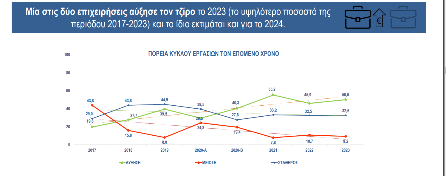 Επιπλέον, 1 στις 2 επιχειρήσεις αύξησε τον τζίρο το 2023 (το υψηλότερο ποσοστό της περιόδου 2017-2023) και το ίδιο εκτιμάται και για το 2024.