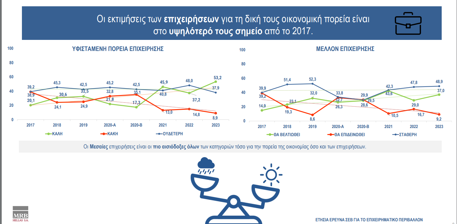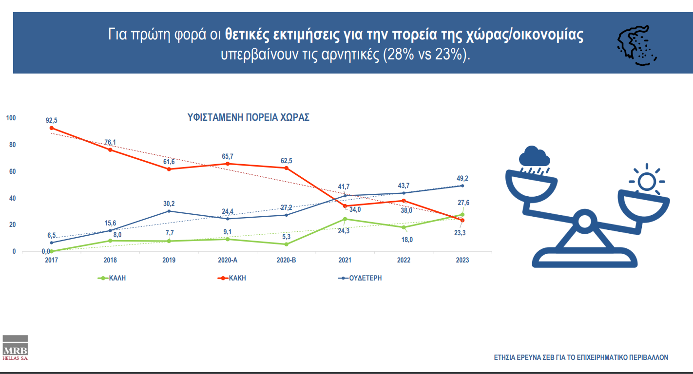 Σύμφωνα με το «Ο σφυγμός του επιχειρείν» που «έτρεξε» σε 624 επιχειρήσεις από τις 5 έως τις 31 Οκτωβρίου με ερωτήσεις (CEO / Γενικοί Διευθυντές / Ιδιοκτήτες), το 28% των ερωτηθέντων κρίνει πως η οικονομική κατάσταση της χώρας σήμερα είναι καλή (έναντι 18% το 2022).