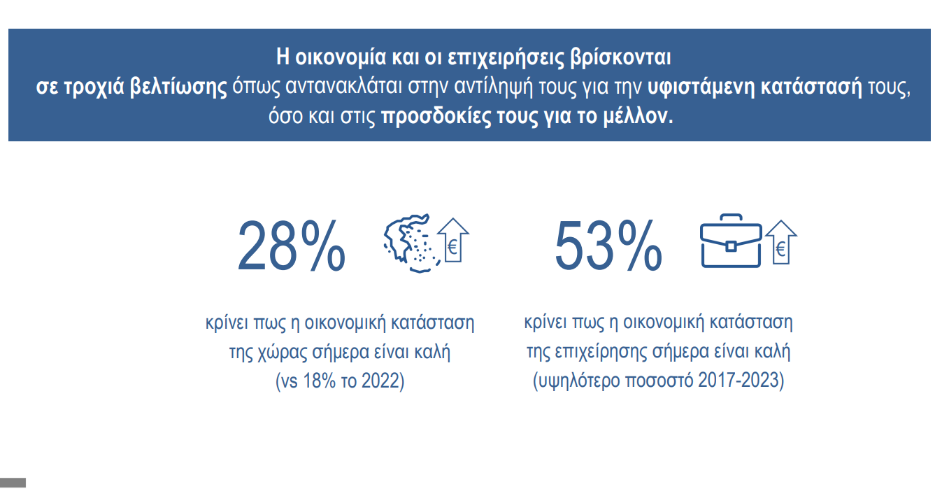 • Οικονομία και επιχειρήσεις βρίσκονται σε τροχιά βελτίωσης (το 28% των επιχειρήσεων θεωρούν ότι η οικονομική κατάσταση της χώρας είναι καλή & το 53% των επιχειρήσεων κρίνει πως η οικονομική τους κατάσταση σήμερα είναι καλή).