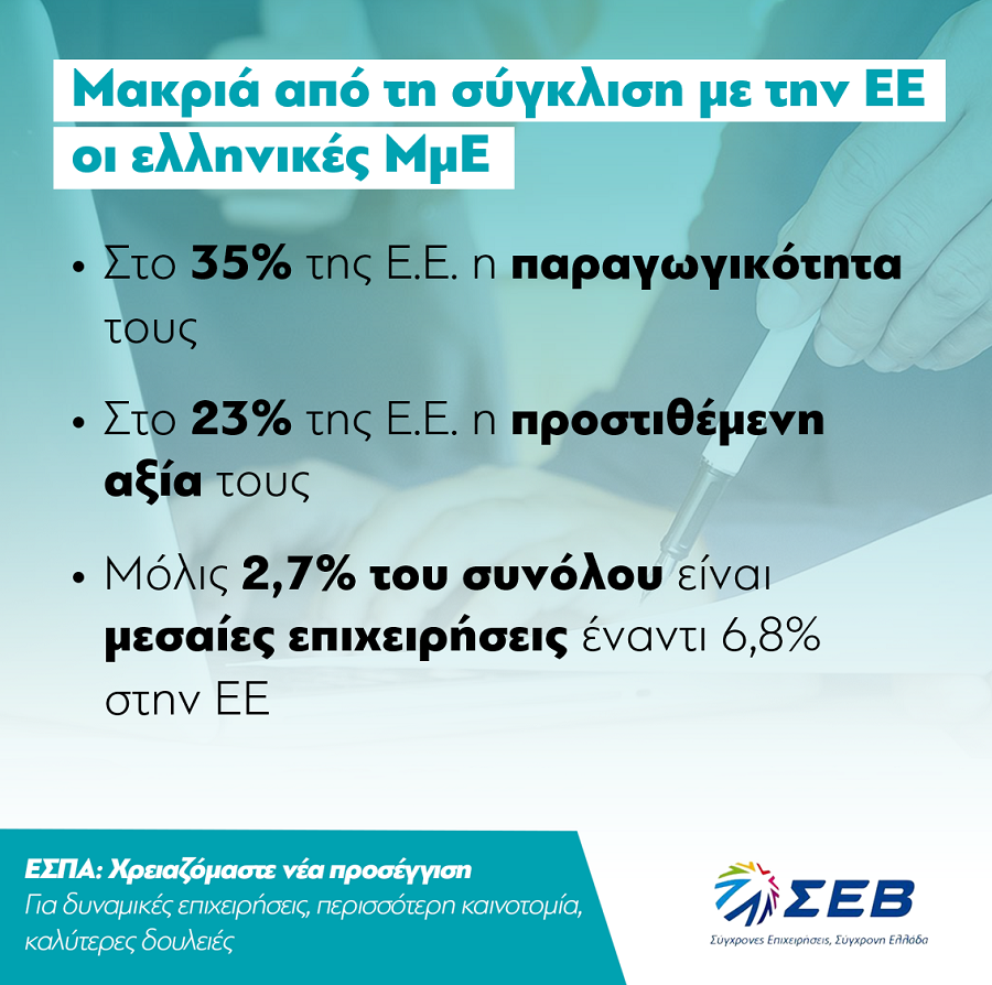 Ενδεικτικά, οι ελληνικές ΜμΕ εξακολουθούν να έχουν το 50% της παραγωγικότητας των αντίστοιχων της ΕΕ. Ακόμα και σε σύγκριση με κοντινές οικονομίες όπως της Πορτογαλίας, οι ελληνικές ΜμΕ δημιουργούν σήμερα 30% λιγότερη προστιθέμενη αξία σε σχέση με το 2008 όταν στην Πορτογαλία δημιουργούν 18% περισσότερη. Επίσης, οι ελληνικές ΜμΕ έχουν εξαγωγές αξίας €20δισ. προϊόντα έναντι €33δισ. στην Πορτογαλία.