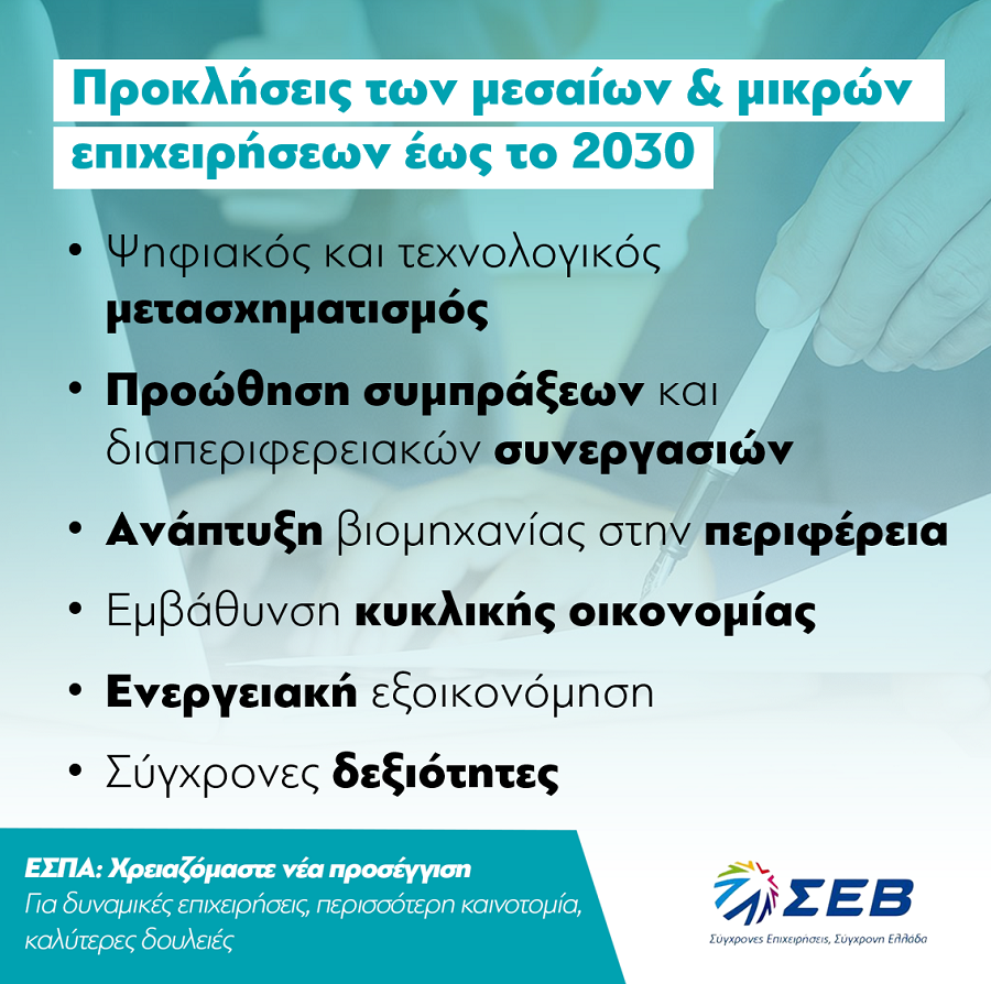 Οπως επισημαίνει, η ποσοτική αύξηση της συνεισφοράς της μεταποίησης στο 15% του ΑΕΠ πρέπει να συνοδεύεται από την ποιοτική αναβάθμιση της λειτουργίας ίδιων των επιχειρήσεων σε αυτές τις κατευθύνσεις, ειδικά των μεσαίων και μικρών (ΜμΕ). Την ίδια στιγμή, η οικονομία, βρίσκεται αντιμέτωπη με την ανάγκη εκτεταμένης επενδυτικής κινητοποίησης. Η πανδημία ανέτρεψε τα επενδυτικά προγράμματα πολλών επιχειρήσεων με το 2020 να βρίσκει τη χώρα με 2,5 φορές λιγότερες επενδύσεις από το 2008 συνολικά, και τις ειδικότερες επενδύσεις σε μηχανολογικό εξοπλισμό μειωμένες κατά 53%. Ο ρόλος του ΕΣΠΑ συνεπώς μπορεί να είναι καθοριστικός, είτε αφορά «πυροσβεστικές» προσεγγίσεις για τη ρευστότητα, είτε αφορά τη υποστήριξη του νέου παραγωγικού προτύπου της χώρας.