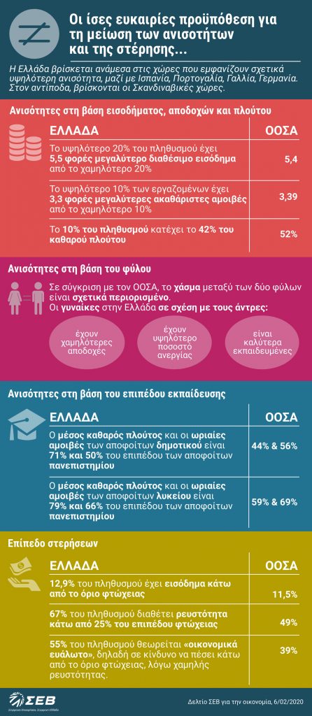 Στην Ελλάδα, αν και η ανισότητα εισοδήματος και πλούτου βρίσκεται στο ίδιο ή χαμηλότερο επίπεδο με τον ΟΟΣΑ, η χώρα μας κατατάσσεται σε υψηλότερα επίπεδα συνολικής ανισότητας και στέρησης σε σχέση με τις περισσότερες ευρωπαϊκές κυρίως χώρες. Συγκεκριμένα, το μέσο διαθέσιμο εισόδημα του υψηλότερου 20% είναι 5,5 φορές μεγαλύτερο από του χαμηλότερου 20% (ενώ στον ΟΟΣΑ 5,4 φορές, στις ΗΠΑ 8,5 φορές και τη Σουηδία 4,1 φορές), και, το πλουσιότερο 10% του πληθυσμού κατέχει το 42% του καθαρού πλούτου (έναντι 52% στον ΟΟΣΑ και 78% στις ΗΠΑ), με το υψηλό ποσοστό ιδιοκατοίκησης στην Ελλάδα να συμβάλει ενδεχομένως στην άμβλυνση των ανισοτήτων πλούτου.