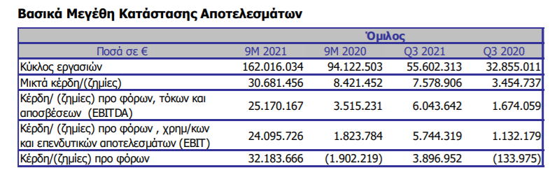 -Διατηρήθηκε η ισχυρή ταμειακή θέση και η μείωση του καθαρού δανεισμού (ευρώ 20.073 χιλ. έναντι ευρώ 16.742 χιλ. και ευρώ 86.645 χιλ. έναντι ευρώ98.409 χιλ. σε σχέση με τον Δεκέμβριο του 2020 αντίστοιχα). Όσον αφορά το πρώτο εννεάμηνο του έτους, ο κύκλος εργασιών του Ομίλου διαμορφώθηκε στα ευρώ 162,0 εκ. ή 72,1% υψηλότερα σε σχέση με την αντίστοιχη περίοδο του 2020, ενώ μαζί με τις πωλήσεις αντιπροσωπείας διαμορφώθηκε στα ευρώ 197,2 εκ. από ευρώ 115,4 εκ. αυξημένος κατά 70,9% σε σχέση με πέρυσι. Τα κέρδη προ φόρων, τόκων και αποσβέσεων (EBITDA) ανήλθαν σε ευρώ 25.170 χιλ. από ευρώ 3.515 χιλ. πέρυσι, ενώ τα αποτελέσματα προ φόρων ανήλθαν σε κέρδη ευρώ 32.184 χιλ. από ζημιές ευρώ 1.902 χιλ. την αντίστοιχη περυσινή περίοδο.