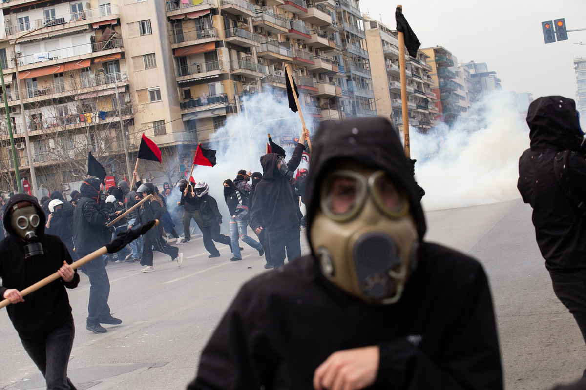 Η ένταση συνεχίστηκε και έξω από το Διοικητήριο, όπου κατέληξε η πορεία, όταν διαδηλωτές έριξαν βόμβες μολότοφ και οι αστυνομικοί τους απώθησαν με καπνογόνα.