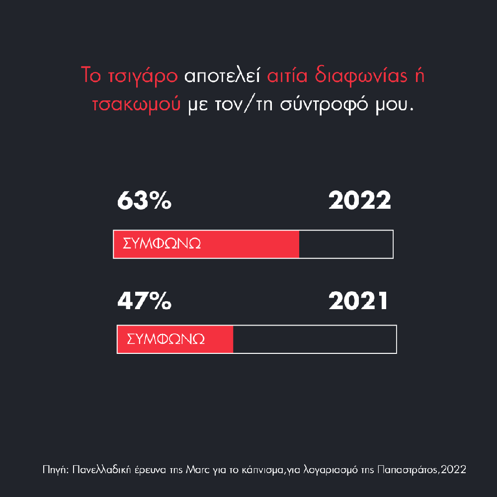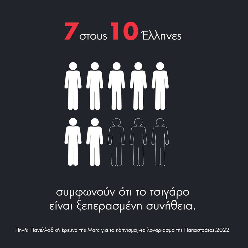 Στη φετινή έρευνα μεγάλη εντύπωση προκαλεί το γεγονός ότι αν και 7 στους 10 ερωτηθέντες θεωρούν το τσιγάρο μια ξεπερασμένη συνήθεια, παρ’ όλα αυτά ο αριθμός των καπνιστών που κάνουν χρήση συμβατικών τσιγάρων στη χώρα μας παρέμεινε, για το 2022, σταθερός με το ποσοστό αυτό να αγγίζει το 28,5%.