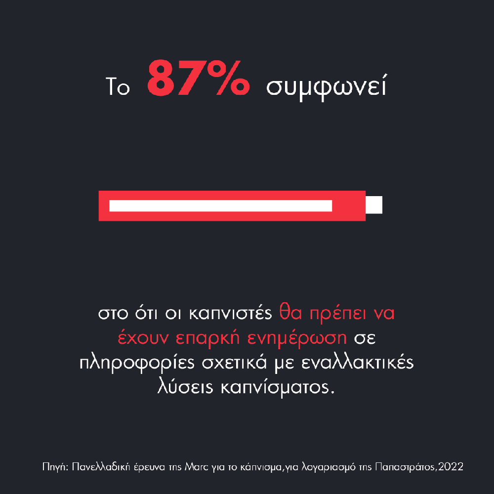 Καπνιστές και μη σε ποσοστό 87% συμφωνούν στο ότι οι καπνιστές θα πρέπει να έχουν επαρκή ενημέρωση και πρόσβαση σε πληροφορίες, ως προς τα εναλλακτικά προϊόντα καπνίσματος. Χαρακτηριστικό είναι το γεγονός πως περισσότεροι από 6 στους 10 ερωτηθέντες (63%) δηλώνουν πως θα τα πρότειναν σε άλλους καπνιστές πιο εύκολα, με την προϋπόθεση ότι θα είχαν σαφή και συγκεκριμένη ενημέρωση για τα επιστημονικά στοιχεία. Η ανάγκη, λοιπόν, για την ύπαρξη συγκροτημένης κι εμπεριστατωμένης ενημέρωσης γύρω από τα εναλλακτικά προϊόντα προβάλλεται επιτακτικά από την έρευνα της Marc κι αυτό είναι κάτι που απασχολεί όλους τους εμπλεκόμενους φορείς.