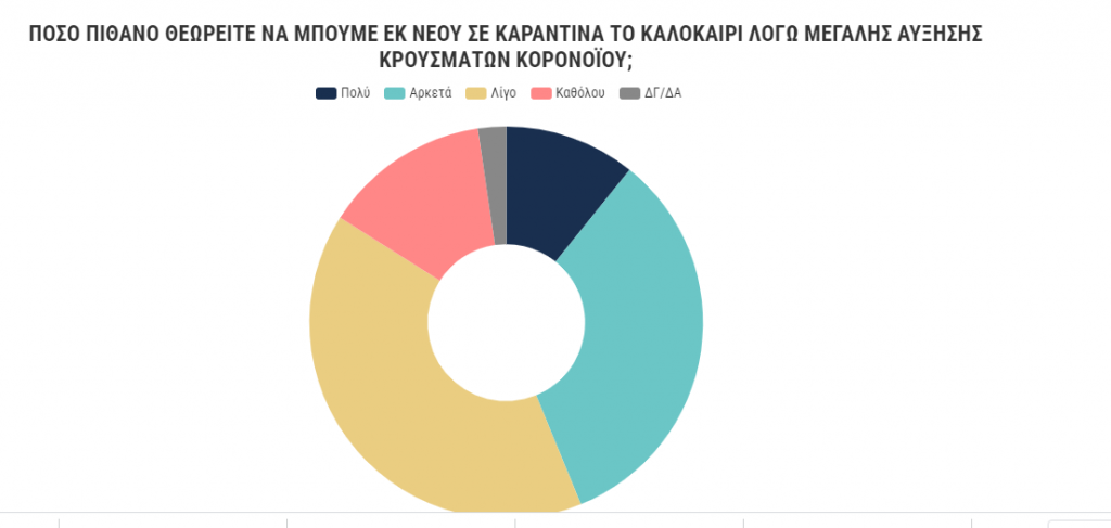 Εξάλλου, το 43,8% των ερωτώμενων θεωρεί ακόμη πιθανό το ενδεχόμενο να ξαναμπούμε σε καραντίνα κατά τη διάρκεια του καλοκαιριού, ποσοστό ελαφρώς μειωμένο από την προηγούμενη έρευνα (48,6%).