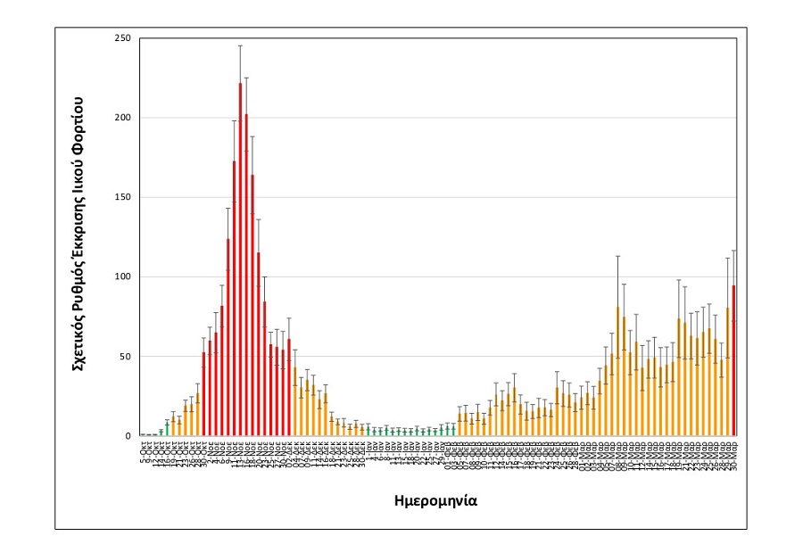 Στα συνημμένα διαγράμματα του ΑΠΘ, που δημοσιεύει το ΑΠΕ-ΜΠΕ, οι ημέρες των δειγματοληψιών που καταγράφονται με κόκκινο χρώμα αντιστοιχούν σε περισσότερα από 500 κρούσματα -όπως ανακοινώθηκαν τις αντίστοιχες ημέρες από τον ΕΟΔΥ- οι μέρες που καταγράφονται με πορτοκαλί σε 100-400 κρούσματα και οι μέρες που καταγράφονται με πράσινο σε λιγότερα από εκατό κρούσματα.