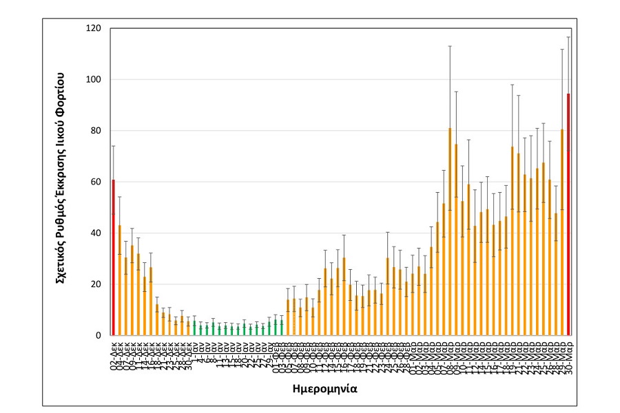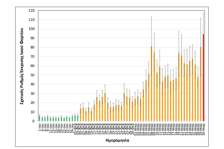 – Αυξημένη κατά 61% σε σχέση με τη μέση τιμή των δύο αμέσως προηγούμενων μετρήσεων, της Παρασκευής 26/3 και της Κυριακής 28/3.