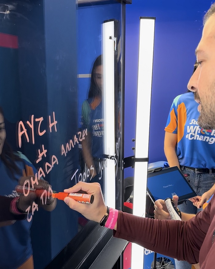 Οι επισκέπτες του περιπτέρου είχαν την ευκαιρία, μέσα από ένα διαδραστικό παιχνίδι, να αφήσουν το δικό τους βιντεομήνυμα, εμπλουτίζοντας τη λογική της ομαδικότητας όπως εκφράζεται με τα μηνύματα της Stoiximan “Τρέχουμε όλοι για όλους” και “Αυτή η ομάδα αλλάζει τα πάντα”.