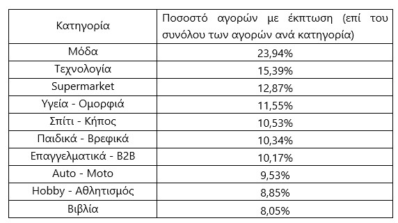 Ωστόσο, οι κατηγορίες στις οποίες οι καταναλωτές επωφελήθηκαν περισσότερο επί των εκπτώσεων και πραγματοποίησαν περισσότερες αγορές, διαμορφώνονται ως εξής: