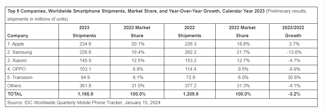 Η Apple και η Transsion, η οποία πωλεί τα εμπορικά σήματα Tecno, Infinix και itel, ήταν οι μόνοι δύο από τους πέντε κορυφαίους προμηθευτές smartphones που κατέγραψαν αύξηση των πωλήσεων στο σύνολο του 2023.