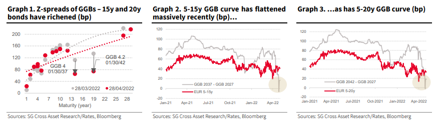 Σε ό,τι αφορά την τρέχουσα επιπέδωση της καμπύλης, μάλλον είναι προσωρινή, «καθώς δεν βλέπουμε κανένα λόγο να την δικαιολογεί, πέρα από τη μειωμένη ρευστότητα της αγοράς» αναφέρει η Societe Generale, με τη γαλλική τράπεζα να δίνει σύσταση buy για το ελληνικό 5ετές και σύσταση «sell» για το 15ετές, και το ακριβώς αντίθετο στα swaps, καθώς αναμένει τις καμπύλες στο τμήμα 5-15 ετών και 5-20 ετών να γίνουν ξανά πιο steep, με ανοδική κλίση.