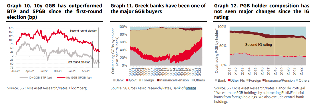 Στη Βουλή μπήκε για πρώτη φορά και το ακροδεξιό κόμμα Σπαρτιάτες. Η ΝΔ και ο αρχηγός της Μητσοτάκης δεσμεύτηκαν να δρομολογήσουν γρήγορα μεγάλες μεταρρυθμίσεις, με επίκεντρο το επιχειρηματικό περιβάλλον και τον τραπεζικό τομέα. Επειδή αυτό ήταν ένα ευρέως αναμενόμενο αποτέλεσμα, λέει η Societe Generale, οι αγορές δεν κινήθηκαν πολύ. To spread μεταξύ του ελληνικού με το ιταλικό δεκαετές είχε ήδη μειωθεί από περίπου -25 μ.β. σε -50 μ.β. μετά τη νίκη της ΝΔ στον πρώτο γύρο των εκλογών (Γράφημα 10).