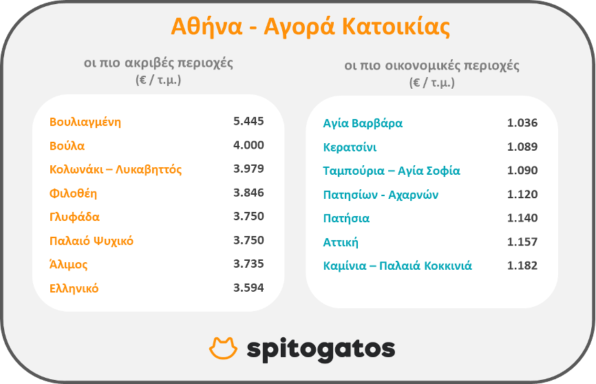 Συγκεκριμένα, οι ακριβότερες περιοχές για αγορά κατοικίας στο λεκανοπέδιο είναι, μεταξύ άλλων, η Βουλιαγμένη και η Βούλα, η περιοχή του Κολωνακίου και του Λυκαβηττού, η Φιλοθέη, η Γλυφάδα, το Παλαιό Ψυχικό, ο Άλιμος και το Ελληνικό. Στις οικονομικότερες περιοχές για αγορά κατοικίας το πρώτο τρίμηνο του 2022 είναι η Αγία Βαρβάρα, το Κερατσίνι και η περιοχή Ταμπούρια – Αγία Σοφία στον Πειραιά.
