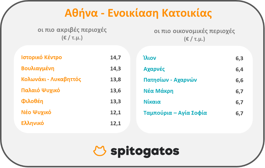 Ως προς την ενοικίαση κατοικίας, το ιστορικό κέντρο, η Βουλιαγμένη, η περιοχή του Κολωνακίου και του Λυκαβηττού, το Παλαιό Ψυχικό, το Νέο Ψυχικό και η Φιλοθέη είναι μεταξύ των ακριβότερων περιοχών της Αττικής, ενώ στη λίστα με τις περιοχές όπου εντοπίζονται τα ακριβότερα ενοίκια συγκαταλέγεται και το Ελληνικό.