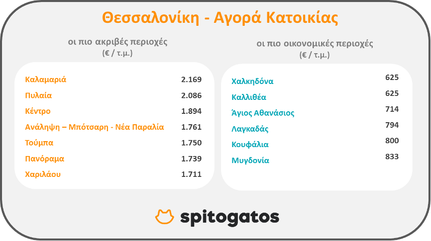Αντίστοιχα, στη Θεσσαλονίκη, οι πιο ακριβές περιοχές για αγορά κατοικίας το α’ τρίμηνο του 2022 ήταν, μεταξύ άλλων, η Καλαμαριά, η περιοχή του κέντρου και το Πανόραμα -στοιχείο το οποίο δεν προκαλεί εντύπωση καθώς πρόκειται για περιοχές που παραδοσιακά ανήκουν στις ακριβότερες τις συμπρωτεύουσας, η περιοχή Ανάληψη – Μπότσαρη – Νέα Παραλία, η Πυλαία και η Τούμπα. Ως προς την αγορά κατοικίας, οι οικονομικότερες περιοχές περιλαμβάνουν, μεταξύ άλλων, την Καλλιθέα, τη Χαλκηδόνα, τον Άγιο Αθανάσιο, τον Λαγκαδά και τα Μυγδόνια.