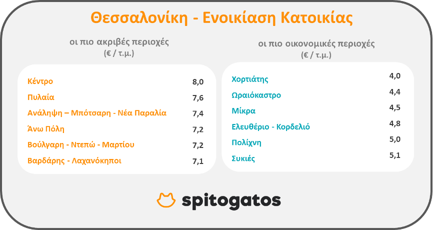 Σε ό,τι αφορά την ενοικίαση κατοικίας, οι ακριβότερες περιοχές ήταν, πέραν του κέντρου της πόλης, η Πυλαία, η Ανάληψη – Μπότσαρη – Νέα Παραλία, η Άνω Πόλη και οι περιοχές Βούλγαρη – Ντεπώ – Μαρτίου και Βαρδάρης – Λαχανόκηποι. Στις οικονομικότερες περιοχές για ενοικίαση κατοικίας, εντοπίζονται ο Χορτιάτης, το Ωραιόκαστρο, ο Δήμος Μίκρας, η Πολίχνη και οι Συκιές.