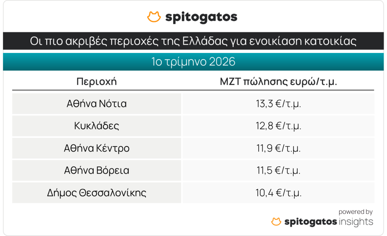Spitogatos: Ράλι στις τιμές ακινήτων το πρώτο τρίμηνο του 2026 – Οι πιο ακριβές και πιο φθηνές περιοχές (πίνακες)