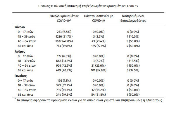 Η μέση ηλικία των κρουσμάτων είναι 47 έτη (εύρος 0 έως 102 ετών), ενώ η μέση ηλικία των θανάτων είναι 76 έτη (εύρος 35 έως 102 ετών). Η ηλικιακή κατανομή των (α) συνολικών κρουσμάτων, (β) των περιστατικών που κατέληξαν σε θάνατο και (γ) των ασθενών που νοσηλεύονται διασωληνωμένοι, είναι η ακόλουθη: