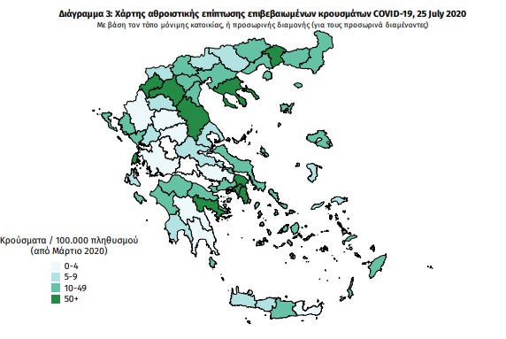 Ο χάρτης αποτυπώνει τη γεωγραφική κατανομή των συνολικών κρουσμάτων COVID-19 (από την αρχή της επιδημίας) ανά Περιφερειακή Ενότητα της χώρας, με βάση την δηλωθείσα διεύθυνση μόνιμης κατοικίας του ασθενούς, ή τη διεύθυνση προσωρινής διαμονής για τους τουρίστες και άλλους προσωρινά διαμένοντες στην Ελλάδα. Συμπεριλαμβάνονται τόσο κρούσματα με ιστορικό ταξιδίου («εισαγόμενα») όσο και κρούσματα με πιθανή εγχώρια μετάδοση.