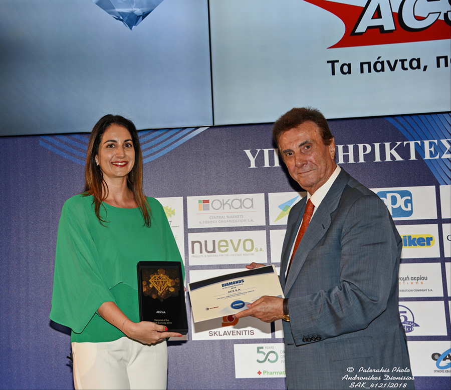 Αντίστοιχη διάκριση απέσπασε η ACS για τρίτη συνεχόμενη χρονιά στον θεσμό «Diamonds of the Greek Economy», που διοργανώνεται από τη New Times Publishing, με στόχο την επιβράβευση της υγειούς επιχειρηματικής δραστηριότητας στην Ελλάδα, βάσει αντικειμενικών οικονομικών δεικτών και κριτηρίων, όπως η κερδοφορία, η δανειακή επιβάρυνση, η ρευστότητα, η σχέση ιδίων προς ξένων κεφαλαίων κ.λ.π. Όπως δήλωσε η Διευθύντρια Μάρκετινγκ της ACS κα Έλια Χάραρη κατά την παραλαβή του βραβείου, «Η ACS αποτελεί αυτή τη στιγμή την πλέον οικονομικά υγιή και τεχνολογικά εξελιγμένη επιχείρηση στο χώρο των υπηρεσιών ταχυμεταφοράς και απλού ταχυδρομείου, με συνεχόμενους ρυθμούς ανάπτυξης – περίπου 9% ετησίως – αυξανόμενη κερδοφορία κάθε χρόνο, μηδενικό δανεισμό, συνεχείς επενδύσεις σε υποδομές, τεχνολογικό εξοπλισμό και νέα συστήματα, οι οποίες την επόμενη διετία θα ξεπεράσουν τα €40.000.000. Απασχολεί 3.000 ανθρώπους σε όλη την Ελλάδα, αλλά και υλοποιεί δράσεις ανθρωπιστικού και κοινωνικού χαρακτήρα αξίας πάνω από 500.000€ ετησίως. Αριθμοί που μας δίνουν την αισιοδοξία, ότι μπορούμε να ατενίζουμε με άλλη σιγουριά το επιχειρηματικό τοπίο των υπηρεσιών στην Ελλάδα, θέτοντας πάντα στο επίκεντρο τους πελάτες μας, τους εργαζόμενους αλλά και τους συνανθρώπους μας.»