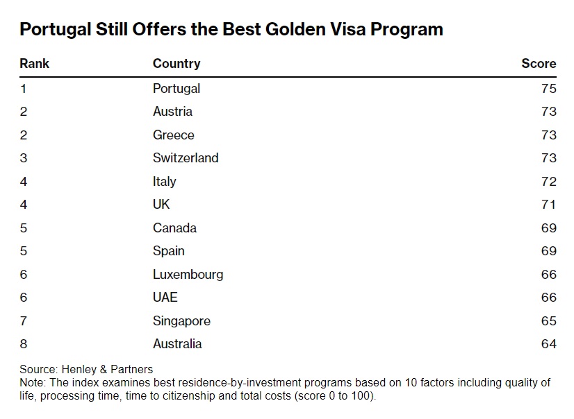 Η Πορτογαλία παρέχει προσιτή και υψηλή ποιότητα ζωής, καθώς και εύκολη πρόσβαση σε άλλες ευρωπαϊκές χώρες καθώς και μια σαφή διαδρομή προς την ευρωπαϊκή ιθαγένεια, σύμφωνα με δείκτη της εταιρείας συμβούλων Henley & Partners, που εξέτασε παράγοντες όπως ο χρόνος μέχρι την υπηκοότητα, οι φόροι, το κόστος και η φήμη. Η Αυστρία και η Ελλάδα ισοβαθμούν στη δεύτερη θέση στην κατάταξη.