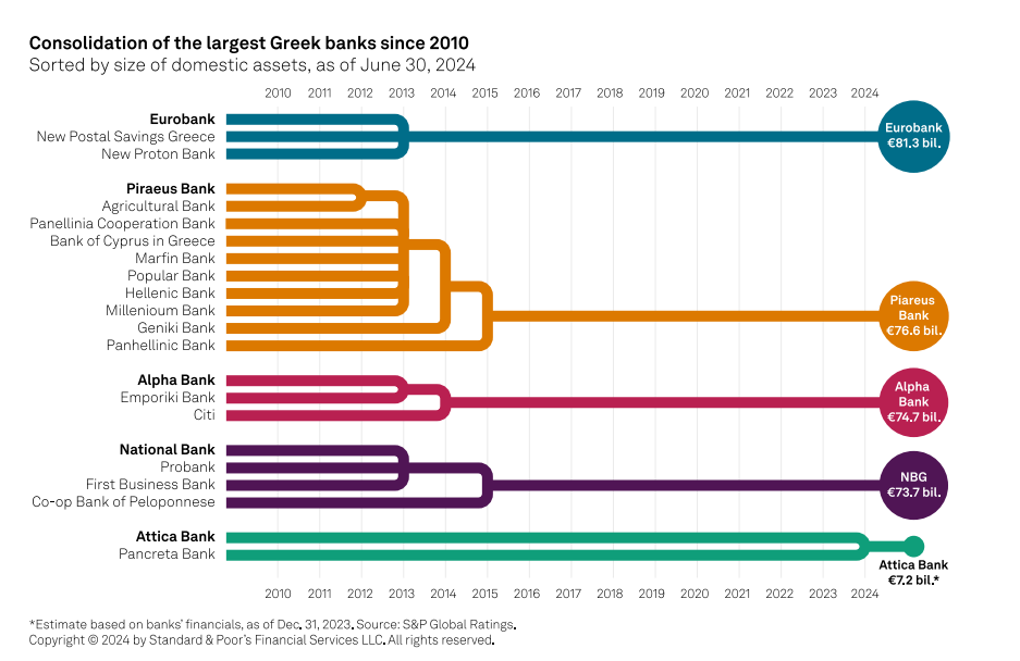 Ειδικότερα, σύμφωνα με την S&P, η ελληνική κυβέρνηση εκκίνησε το ΤΧΣ το 2010 για να σταθεροποιήσει τον ελληνικό τραπεζικό τομέα κατά τη διάρκεια της κρίσης δημόσιου χρέους της χώρας. Με την υποστήριξη του ΤΧΣ, το ελληνικό τραπεζικό σύστημα ενοποιήθηκε κατά μεγάλο ποσοστό, πράγμα που σημαίνει ότι οι τέσσερις εγχώριες συστημικά σημαντικές τράπεζες της Ελλάδας (D-SIBs) και η Attica Bank αντιπροσωπεύουν πλέον το 98% του ενεργητικού του ελληνικού τραπεζικού συστήματος, έναντι 68% στο τέλος του 2007.