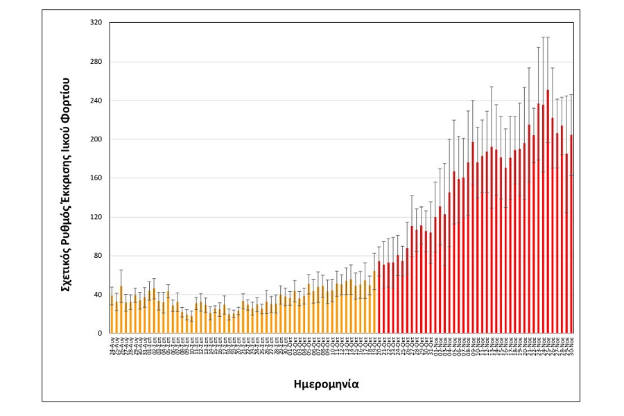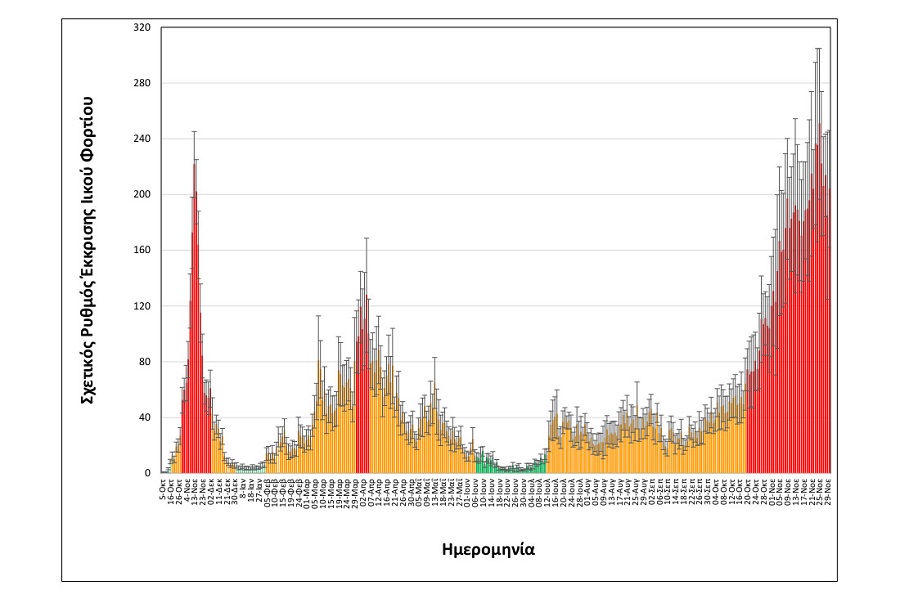 Όπως φαίνεται στα διαγράμματα που παρουσιάζει το ΑΠΕ-ΜΠΕ, το ιικό φορτίο των λυμάτων μετρήθηκε στις 25 Νοεμβρίου στην υψηλότερη τιμή από αρχή της πανδημίας και τις επόμενες μέρες σε ελαφρώς χαμηλότερο επίπεδο.