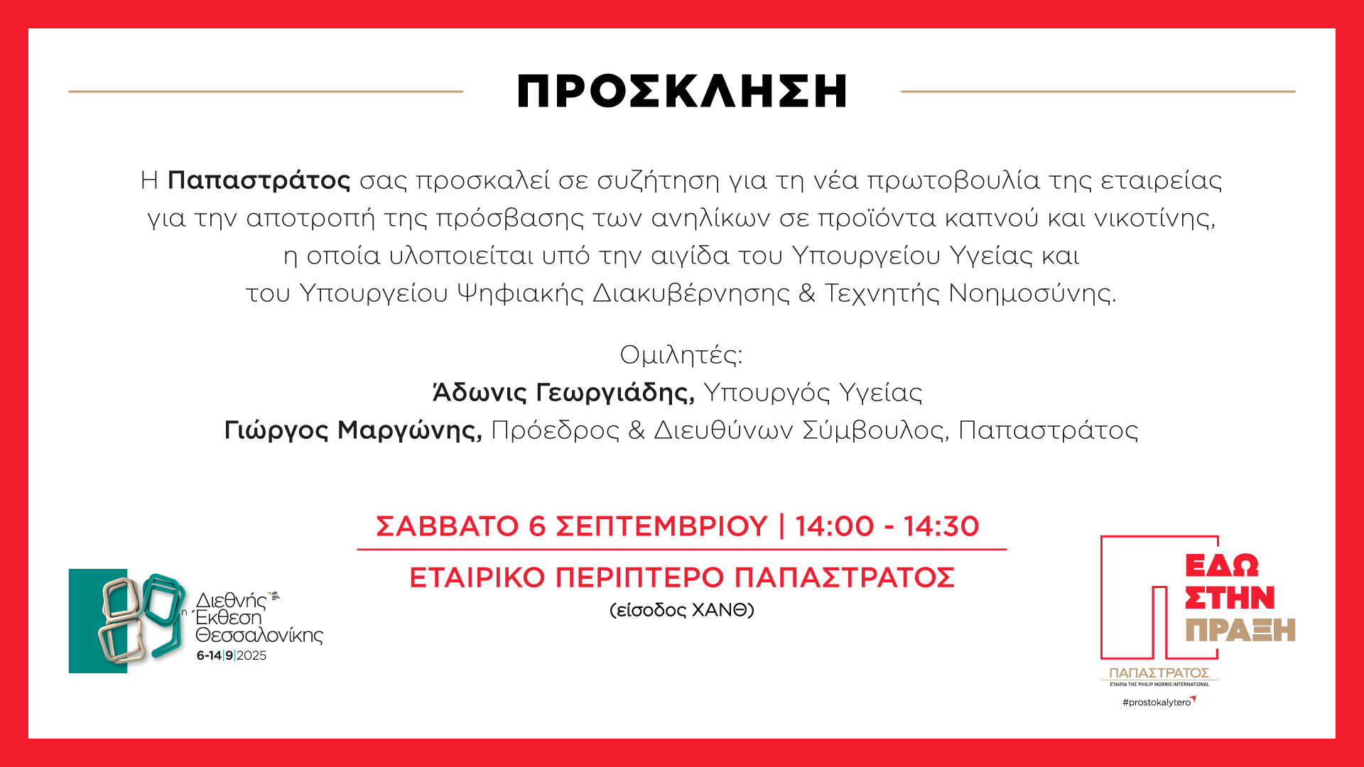 14:00-14:30 | Συζήτηση για τη νέα πρωτοβουλία της Παπαστράτος για την αποτροπή της πρόσβασης των ανήλικων σε προϊόντα καπνού και νικοτίνης – Ομιλητές: Ο υπουργός Υγείας, Άδωνις Γεωργιάδης και ο Πρόεδρος και Διευθύνων Σύμβουλος της Παπαστράτος, Γιώργος Μαργώνης