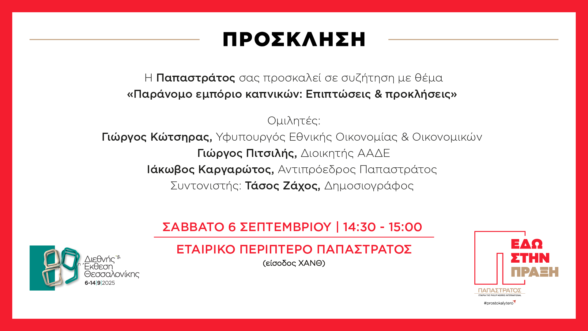 Η Παπαστράτος στο πλαίσιο της 89ης Διεθνούς Έκθεσης Θεσσαλονίκης, προσκαλεί σε δύο ενδιαφέρουσες συζητήσεις στο εταιρικό της περίπτερο (είσοδος ΧΑΝΘ) το Σάββατο, 6 Σεπτεμβρίου.