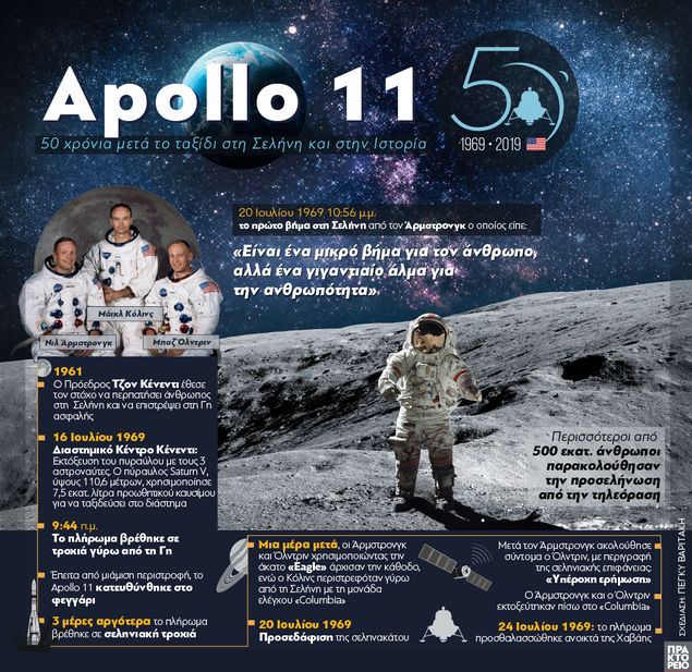 Το Apollo (Απόλλων) 11 είχε εκτοξευτεί με έναν πύραυλο Saturn V από το Διαστημικό Κέντρο Κένεντι στο νησί Μέριτ στη Φλόριντα στις 16 Ιουλίου και ήταν η πέμπτη επανδρωμένη αποστολή του προγράμματος Apollo της NASA.
