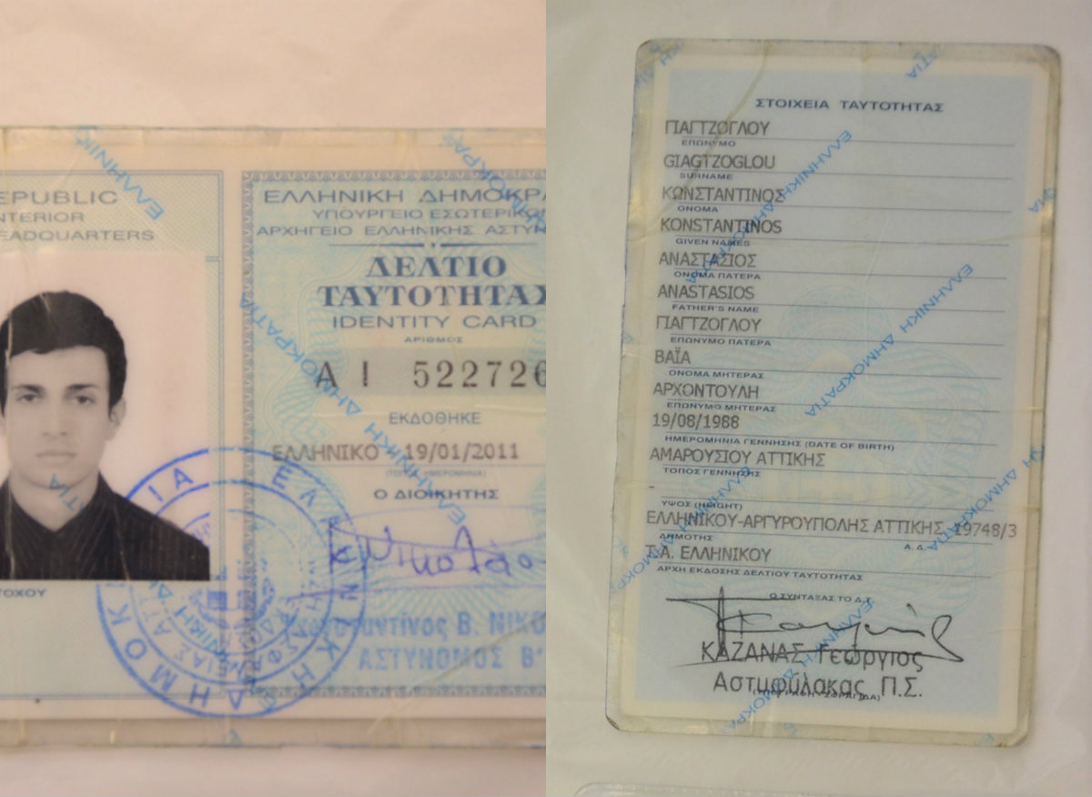 – Δελτίο Αστυνομικής Ταυτότητας με αριθμό «ΑΙ-215438», με ημερομηνία έκδοσης «20/06/2011» και στοιχεία κατόχου «Παναγιωτόπουλος Χρήστος», όνομα πατρός «Νικόλαος», όνομα μητρός «Μαρία», ημερομηνία γέννησης 18/02/1990, τόπο γέννησης «Αμαρούσιο Αττικής» και εκδούσα αρχή «ΤΑ Νέας Ιωνίας».