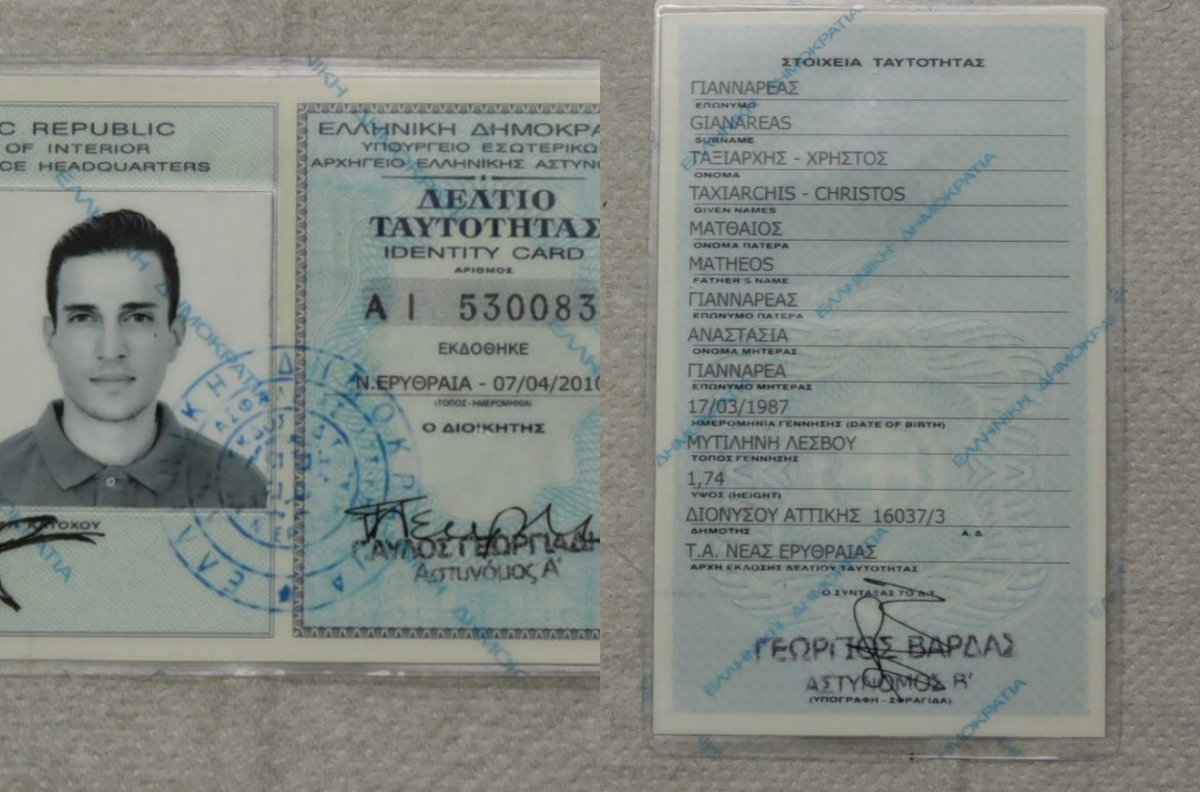 – Δελτίο Αστυνομικής Ταυτότητας με αριθμό «ΑΙ-530083», με ημερομηνία έκδοσης «07/04/2010» και στοιχεία κατόχου «Γιαναρέας Ταξιάρχης- Χρήστος», όνομα πατρός «Ματθαίος», όνομα μητρός «Αναστασία», ημερομηνία γέννησης 17/03/1987, τόπο γέννησης «Μυτιλήνη Λέσβου» και εκδούσα αρχή «ΤΑ Νέας Ερυθραίας».