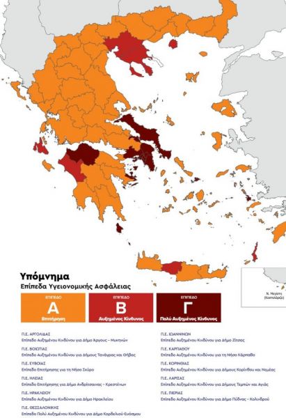 Στο «κόκκινο» παραμένουν: ο δήμος Αγιάς Λαρίσης, ο δήμος Τεμπών Λαρίσης, ο δήμος Ηρακλείου Κρήτης, οι Δήμοι Κορίνθου και Νεμέας, ο δήμος Άργους- Μυκηνών, ο δήμος Ζίτσας Ιωαννίνων, η Περιφερειακή Ενότητα Θεσσαλονίκης, η Περιφερειακή Ενότητα Χαλκιδικής, η Περιφερειακή Ενότητα Ρεθύμνου, ο δήμος Τανάγρας, ο δήμος Θηβαίων, ο δήμος Πύδνας – Κολινδρου Πιερίας και ο δήμος Καρπάθου.