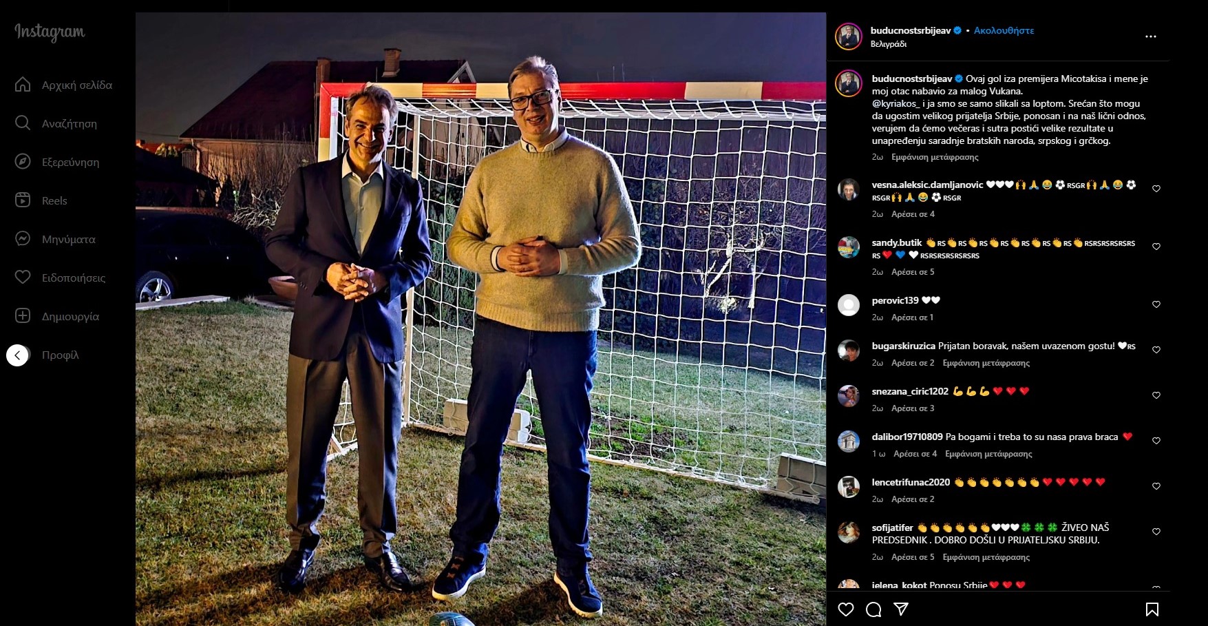 Ο Βούτσιτς ανήρτησε στο Instagram φωτογραφία μαζί με τον Έλληνα πρωθυπουργό μπροστά από μία εστία ποδοσφαίρου όπου έγραψε: «Αυτήν την εστία πίσω από τον πρωθυπουργό Μητσοτάκη και εμένα την αγόρασε ο πατέρας μου για τον μικρό Βούκαν (σ.σ. Ο εξάχρονος γιος του Αλ. Βούτσιτς). Ο Κυριάκος και εγώ απλά βγήκαμε φωτογραφία με την μπάλα. Χαίρομαι που μπορώ να φιλοξενήσω έναν μεγάλο φίλο της Σερβίας, είμαι περήφανος για την προσωπική μας σχέση, πιστεύω ότι θα επιτύχουμε σπουδαία αποτελέσματα στη βελτίωση της συνεργασίας μεταξύ των αδελφών λαών, του σερβικού και του ελληνικού».