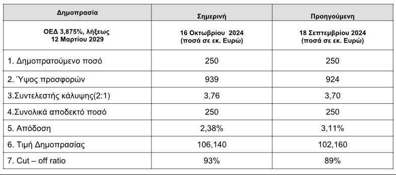 Οι συνολικές προσφορές ανήλθαν σε 939 εκατ. ευρώ και η ημερομηνία διακανονισμού είναι η Τετάρτη 23 Οκτωβρίου 2024.