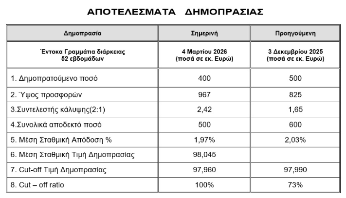 Απόδοση: Η απόδοση των εντόκων γραμματίων 52 εβδομάδων διαμορφώθηκε στο 1,97%, στη σημερινή δημοπρασία μέσω των βασικών διαπραγματευτών αγοράς.