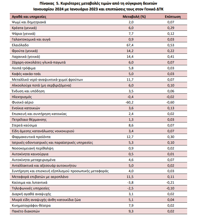 Σύμφωνα με την ΕΛΣΤΑΤ, η αύξηση του γενικού δείκτη τιμών καταναλωτή τον Ιανουάριο 2024 προήλθε κυρίως από τις μεταβολές στις ακόλουθες ομάδες αγαθών και υπηρεσιών: