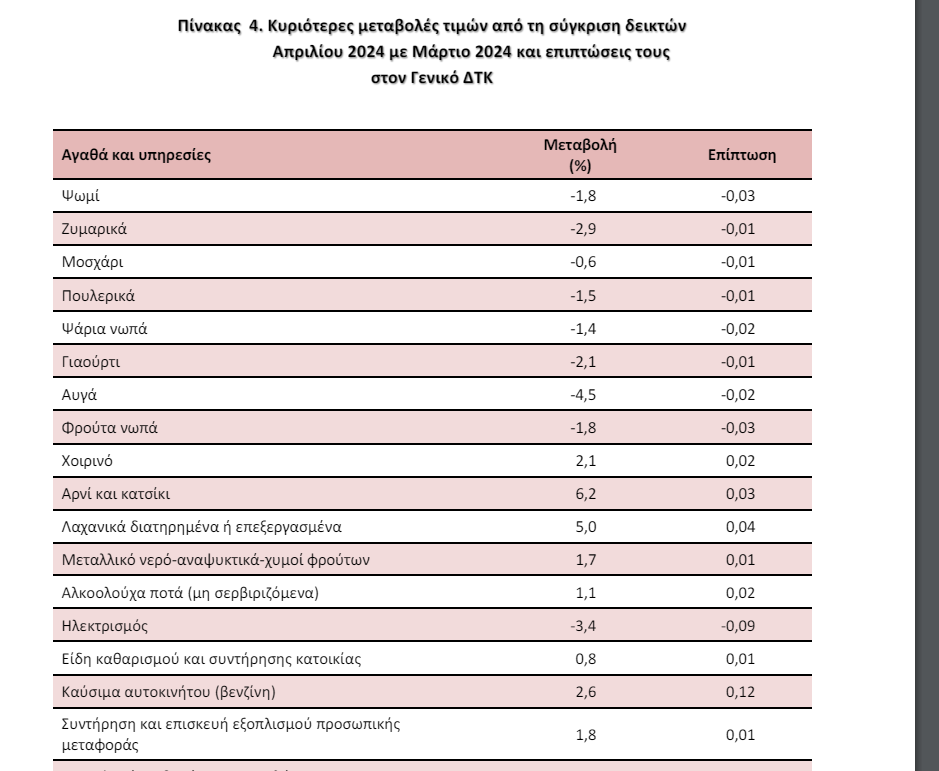 Η αύξηση του Γενικού ΔΤΚ κατά 0,5% τον μήνα Απρίλιο 2024, σε σύγκριση με τον αντίστοιχο Δείκτη του Μαρτίου 2024, προήλθε κυρίως από τις μεταβολές στις ακόλουθες ομάδες αγαθών και υπηρεσιών: