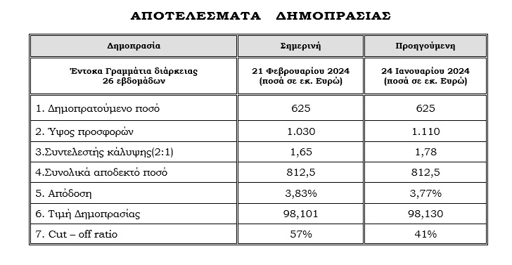 Έγιναν δεκτές προσφορές μέχρι του ύψους του δημοπρατηθέντος ποσού, καθώς και μη ανταγωνιστικές προσφορές ύψους 187,5 εκατομμυρίων ευρώ. Δεν θα γίνουν αποδεκτές συμπληρωματικές μη ανταγωνιστικές προσφορές την Πέμπτη 22 Φεβρουαρίου 2024.