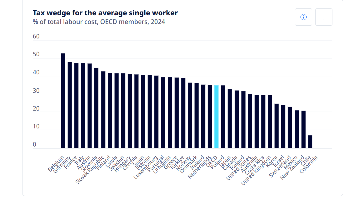 Τα στοιχεία αφορούν τη φορολογική επιβάρυνση για τον μέσο εργαζόμενο στις χώρες του ΟΟΣΑ, δηλαδή τον φόρο εισοδήματος συν κοινωνικές εισφορές εργαζομένων και εργοδοτών, μείον παροχές σε είδος, ως ποσοστό του κόστους εργασίας.
