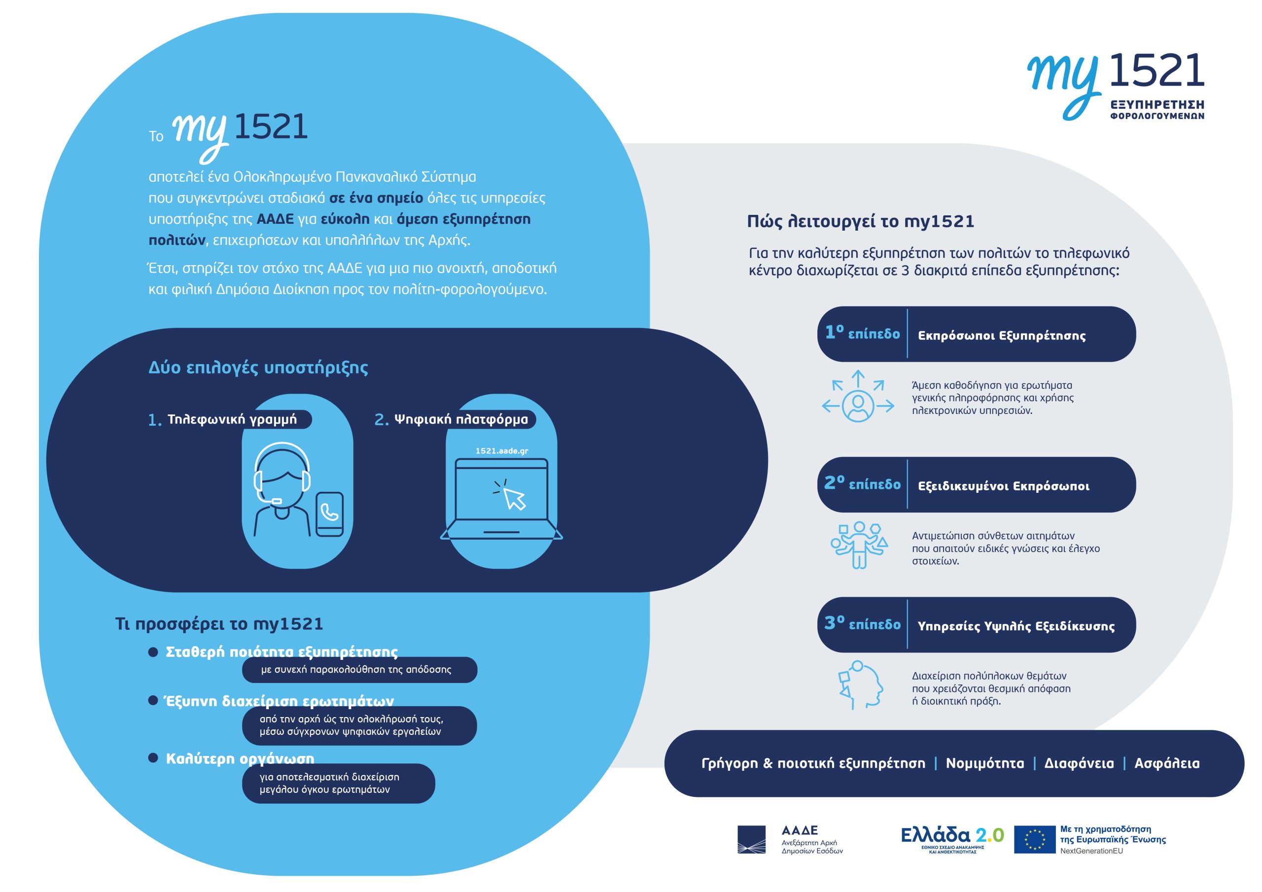 Το my1521 αποτελεί έργο αιχμής και αποτελεί έναν κεντρικό πυλώνα ψηφιακού μετασχηματισμού της Δημόσιας Διοίκησης, προσφέροντας πολυκαναλική και προσωποποιημένη εξυπηρέτηση, με αξιοποίηση τεχνολογιών τεχνητής νοημοσύνης, αυτοματισμών και προηγμένων CRM εργαλείων.