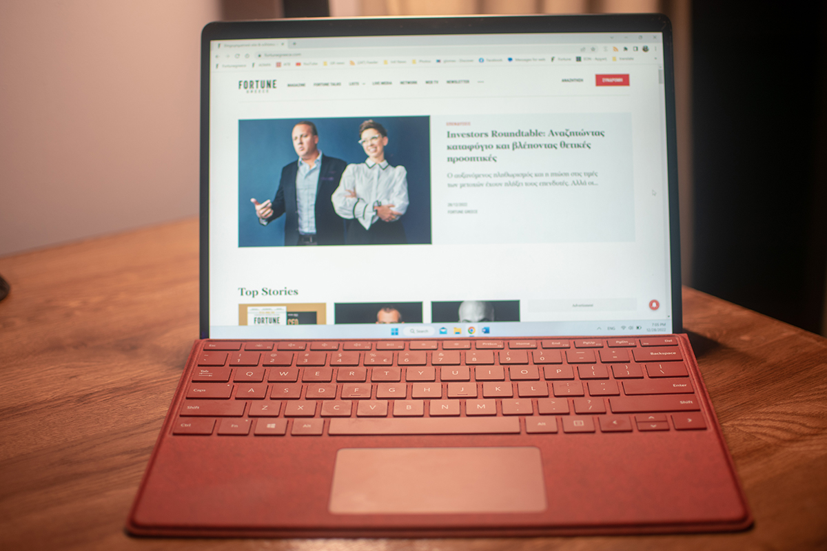 Τις επόμενες μέρες όλες οι εργασίες μου έγιναν από το Surface Pro 9. Συνολικά δούλεψα το backend του Fortune Greece, με αναρτήσεις και παράλληλα περίπου 10 browser tabs ανοιχτά σχεδόν όλες τις ώρες. Για πάνω από 2 ώρες είχα ταυτόχρονα ανοιχτά email app, Word και Excel με πολλά back and forth μεταξύ των προγραμμάτων αλλά και συνδεδεμένο το ασύρματο ποντίκι με USB dongle -σε αντάπτορα. Την πρώτη μέρα, μετά από το αρχικό setup, τα Windows updates και την εργασία μου με την οθόνη στα 120Hz, η μπαταρία έφτασε στο 20% και το power saving mode σε 6 ώρες συνεχούς δουλειάς. Μετά το 20% λειτούργησε σε λίγο χαμηλότερο ρυθμό για ακόμη μια ώρα και έπεσε στο 13%. Καθ’ όλη τη διάρκεια της δουλειάς μου δεν παρατήρησα κανένα κόλλημα στα προγράμματα, ούτε καθυστέρηση στο workflow. Ο ανεμιστήρας δεν ακουγόταν σχεδόν καθόλου ούτε με τη χρήση πολλαπλών προγραμμάτων. Η σύνδεση στο διαδίκτυο έγινε μέσω WiFi 5, αλλά το Surface Pro υποστηρίζει και το πρωτόκολλο WiFi6E για όποιον διαθέτει αντίστοιχο router.
