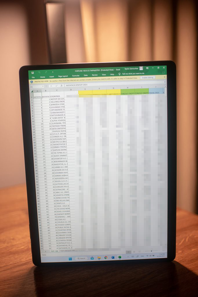 Αυτό που επίσης βρήκα πολύ βολικό, αν και ποτέ σε καθημερινή βάση δεν είναι μέσα στα αντικείμενά μου, είναι η εργασία σε αρχεία Excel με πολλές καταχωρήσεις. Πιο συγκεκριμένα, επεξεργαζόμενος τη λίστα Fortune 100 με τις 100 μεγαλύτερες επιχειρήσεις στην Ελλάδα για να ανέβει και ψηφιακά στη σελίδα του Fortune, χρησιμοποίησα τη δυνατότητα του rotation της οθόνης. Γυρίζοντας κατά 90ο τη συσκευή, γύρισε και η σελίδα του Excel με αποτέλεσμα να διαβάζω χωρίς την ανάγκη scroll down περισσότερα κελιά με στοιχεία της λίστας. Κάτι που φαντάζομαι πως θα φανεί ιδιαίτερα χρήσιμο για όσους δουλεύουν σε περιβάλλον Microsoft Excel. Επίσης ένα ακόμη tip που με βοήθησε, είναι η δυνατότητα αυτόματης διάταξης ανοιχτών παραθύρων στην επιφάνεια εργασίας, όταν σέρνεις ένα ανοιχτό παράθυρο στο πάνω μέρος της οθόνης όπου εμφανίζεται η επιλογή πολλαπλών παραθύρων με συγκεκριμένη διάταξη (Windows 11 Snap Layout).