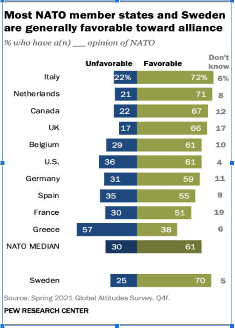 Τελειώνοντας, επισημαίνουμε ότι η Συμμαχία προέβη πρόσφατα σε έρευνα που αφορά στην αποδοχή της από δέκα κράτη μέλη της. Η συντριπτική πλειονότητα έχει θετική γνώμη. Με εξαίρεση την Ελλάδα, για ευνόητους λόγους – αν και σταδιακά αυξάνονται αργά οι θετικές γνώμες.